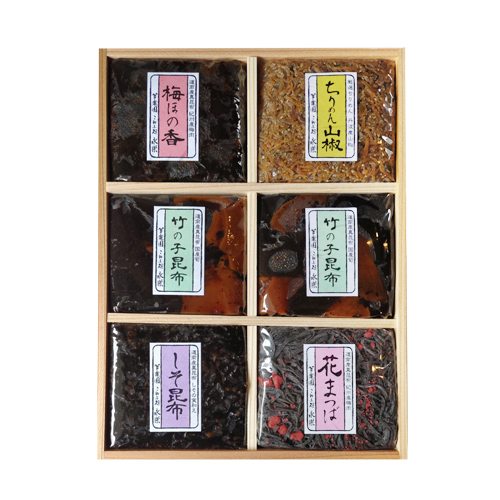 今が旬の竹の子をほどよい食感を残して炊き、真昆布と合わせた『竹の子昆布』と一口サイズの道南産真昆布を極上醤油で煮上げ梅肉とあえた『梅ほの香』、北海道の真昆布とシソを醤油で炊き上げました『しそ昆布』と当店大人気の『ちりめん山椒』『花まつば』の計5種の詰合せです。